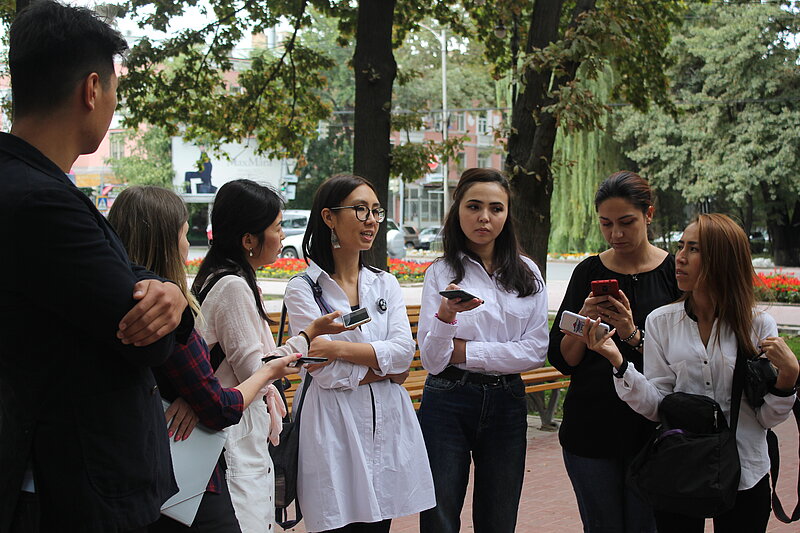 On September 12, a press tour was conducted in Bishkek with participation of five news agencies, five television channels and one printing publication. The event was aimed at familiarizing the media representatives with initiatives of the Institute for Youth Development supported by DVV International and at the same time highlighting the problems associated with acts of vandalism targeting new installations and products the city society is not familiar with. The goal was achieved through the organization of an informal meeting with journalists during which they were able to ask all the questions to organizers during a visit to the following main locations::
