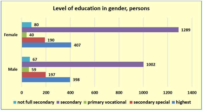 The absence of gender stereotypes in the choice of education is encouraging issue (Fig. 2). Considering the fact that women took part in the survey by 4% more than men, the number of people with higher education among men is 9 people more than among women (by 3%), there are more people with secondary specialized education among men than among women by only 2%.
