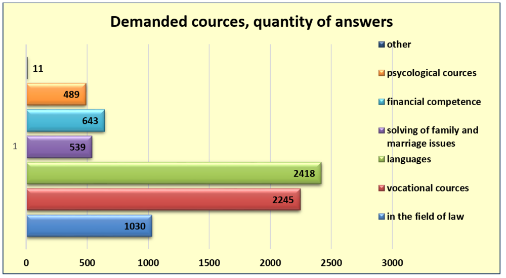 65% of the respondents wish to attend language courses (Fig. 1). Presumably these are potential labor migrants who need the language skills of the destination country. 60% expressed a demand for professional courses, more than a thousand respondents (28%) need knowledge in the field of law. 17% of survey participants wish to take financial literacy courses. 13% and 14%, respectively, are interested in psychology courses and in solving family and marriage issues.