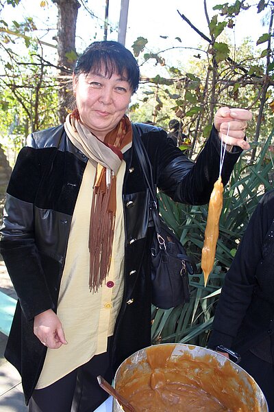 The meaning of practical elements in any learning experience was demonstrated to participants one more time when they were shown how to make churchkhelas – a traditional sausage-shaped candy made by repeatedly dipping a long string of nuts in a mixture of flour, sugar and concentrated fresh grape juice.
