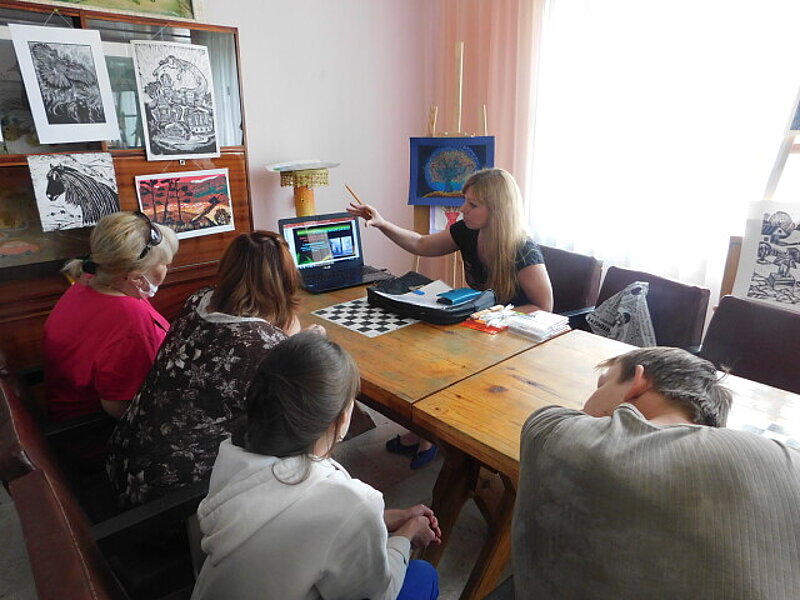 Андрей: Всего за два года у нас было шесть курсов. На кулинарном курсе повар 5-6 разряда помогает людям учиться готовить — начиная с нарезки салатов и заканчивая приготовлением борща и чебуреков. Второй курс — это курс компьютерной грамотности. Он заключается в том, что с нуля научить человека, который мало знаком с компьютером, пользоваться им, помочь ему в обучении компьютерной грамотности и использовании отдельных служб, таких как М-банкинг, интернет-банкинг, чтобы облегчить тоже жизнь и оплату тех же коммунальных услуг. Третье направление — это арт-терапия. Профессиональный арт-терапевт помогает участникам открыть внутренний мир и попытаться красками разукрасить жизнь и сделать ее ярче и светлее. Многим людям это понравилось, многие решили, что стоит этим заниматься дальше, чтобы разгрузить свое душевное состояние. Четвертый курс — это курс аэробики, тоже с профессиональным преподавателем. Еще у нас был “Курс жизни на инвалидной коляске”. Человек, который прошел сборы активной реабилитации и был инструктором, преподавал курс лекций, начиная от анатомии травмы, заканчивая спортом, и отвечал на все вопросы, которые интересуют людей, передвигающихся на колясках. К сожалению, он не всем был полезен, потому что направлен в основном на людей на колясках и людей с первой группой инвалидности, а в отделении реабилитации есть люди и со второй, и с третьей группой, которых эта тема не очень касается. Поэтому после первого года мы заменили этот курс швейным делом. С помощью DVV мы привлекли хороших специалистов, для которых был важен опыт работы с людьми с инвалидностью, и они были приятно удивлены, насколько люди тянулись к новым занятиям.