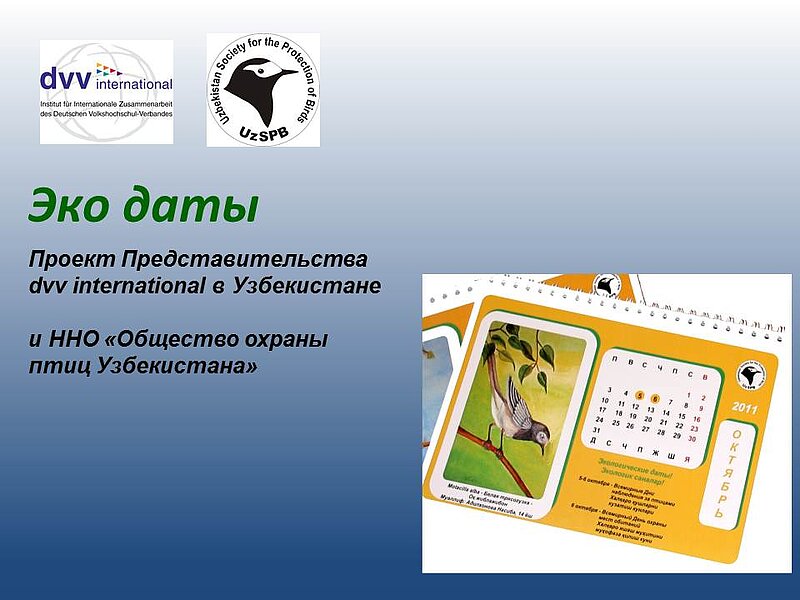 2 апреля 2012 года Общество охраны птиц Узбекистана совместно с dvv international в Узбекистане провело презентацию комплекта образовательных материалов «Эко даты». Данное мероприятие было приурочено к Международному Дню птиц. Эта экологическая дата празднуется по всему миру в первых числах апреля на протяжении более 100 лет.