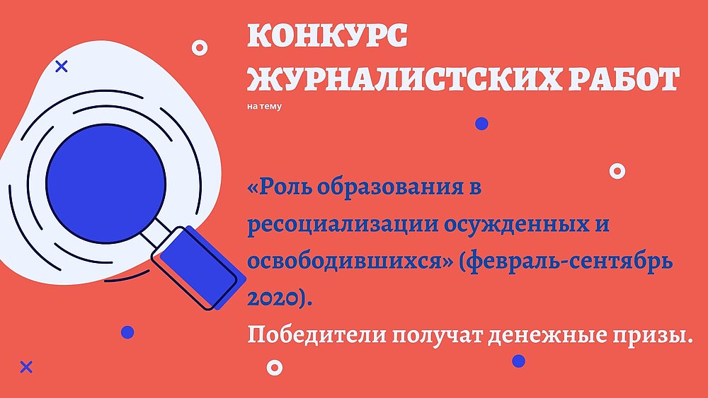 Конкурс проводится в рамках реализации проекта «Активно за образование в пенитенциарных учреждениях 2.0», направленного на увеличение числа некоммерческих организаций, работающих в пенитенциарных учреждениях, укрепление их потенциала для работы с осужденными и освободившимися и организацию инновационных образовательных программ для данных целевых групп, а также на укрепление взаимодействия субъектов гражданского общества со СМИ и журналистами в целях освещения роли и важности образования в ресоциализации осужденных и освободившихся.
