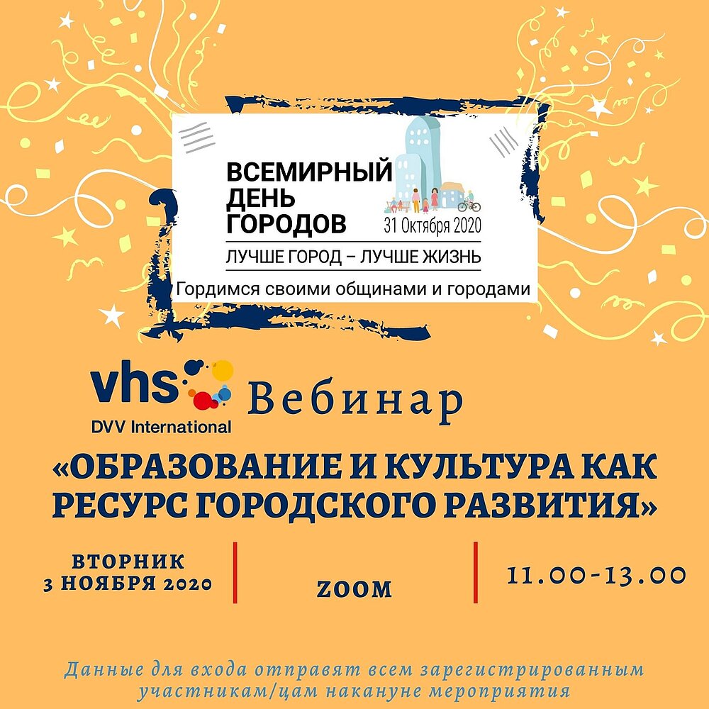 Приглашаем 3 ноября (11.00-13.00) на вебинар «Образование и культура как ресурс городского развития», посвященный Всемирному дню обучающихся городов. Полную программу дня ищите по ссылке.