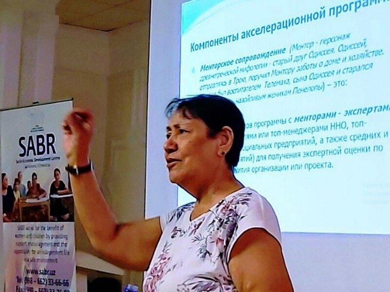 На фото: Презентация Д. А. Бабаджановой "Акселерационные программы для организационного развития социально-ориентированных ННО", 11 июля 2019 г. Источник: Филиал DVV в Узбекистане.