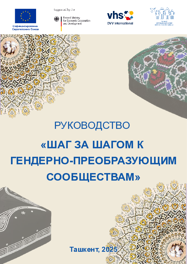 Руководство «Шаг за шагом к гендерно-преобразующим территориям/сообществам» разработано в рамках проекта «Содействие гендерным преобразованиям в сообществах через участие гражданского общества» («Promoting Gender Transformative Communities through Civil Participation») при финансовой поддержке Европейского Союза и Федерального Министерства экономического сотрудничества и развития Германии, который реализуется офисами Филиала DVV в Узбекистане и Республиканского центра социально-экономического развития «САБР» совместно с партнерами.