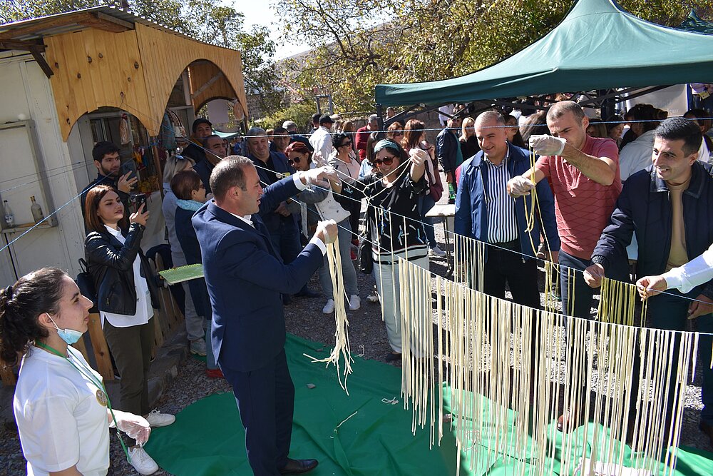 - On October 10, “Arishta Festival” took place in Bjni community of Kotayk region. The purpose of this colorful and interactive event was the preservation and populariziation of arishta (Armenian handmade pasta) making. The festival also served as a platform for an intergenerational dialogue about transfer of traditions. The guests of the festival, community members had an opportunity to involve in different processes of arishta making as well as taste different dishes made of arishta and generally the produce and products typical to the region. The festival was organized and implemented by DVV International’s partner organization in Kotayk, Improve Our Village NGO.