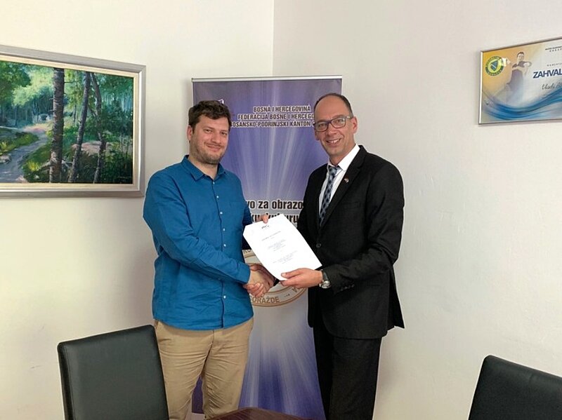 Director of DVV International - Country Office Bosnia and Herzegovina, Mr Emir Avdagić, PhD, yesterday, on 21st of May, held a meeting with the newly appointed Minister of Education, Youth, Science, Culture and Sport of Bosnia-Podrinje Canton Goražde, Mr Arman Bešlija. In accordance with the annual plan of activities of DVV International for 2019, an Agreement on Cooperation with the Ministry was singed at the meeting.