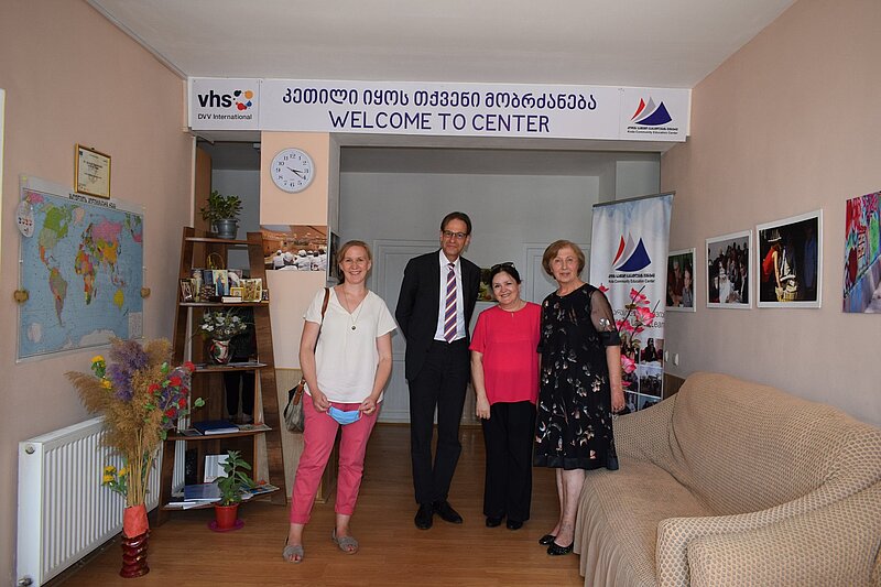 On July 7 2020, German Ambassador to Georgia. H.E. Mr. Hubert Knirsch paid his visit to the Koda Community Education Center. After Akhaltsikhe Adult Education Center and Kharagauli Adult Education Center this is the third visit of His Excellency to DVV International’s biggest project “Adult Education Centers in Georgia.” In Koda CEC the Ambassador and representatives of the Deutsche Gesellschaft für Internationale Zusammenarbeit (GIZ) attended trainings for the members of youth and women clubs created in the framework of the GIZ supported project “Economic and Social Participation of Vulnerable Displaced Persons (EPIC)” aimed at increasing economic and social participation of vulnerable displaced persons. Mr. Hubert Knirsch talked to the beneficiaries of the project, as well as, to beneficiaries of different vocational education courses provided by the Koda CEC with the support of DVV International and mentioned the importance of activities and adult education programmes implemented by DVVI with the support of German Government.