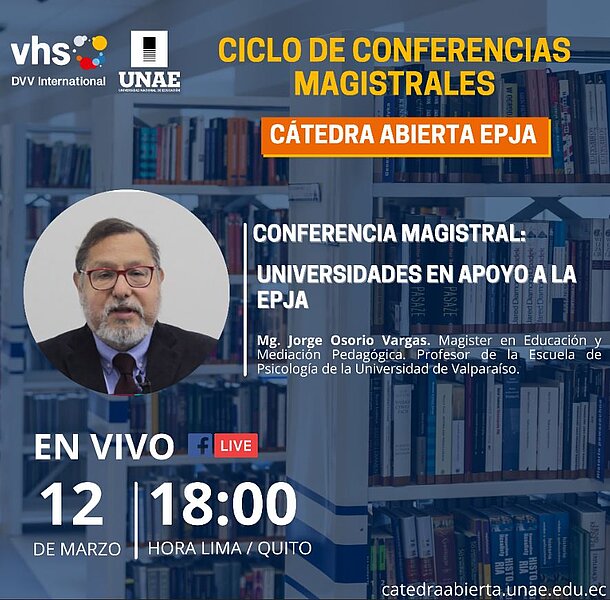 La segunda conferencia de la Cátedra Abierta EPJA, con el auspicio de la Maestría de Educación de Jóvenes y Adultos de la Universidad Nacional de Educación (UNAE) del Ecuador y de los Cursos de Diplomado en Educación de Jóvenes y Adultos con mención en Currículum GlobALE, apoyados en ambos casos por la DVV International, se realizará el 12 de marzo de 2021 a las 18:00, hora del Perú.