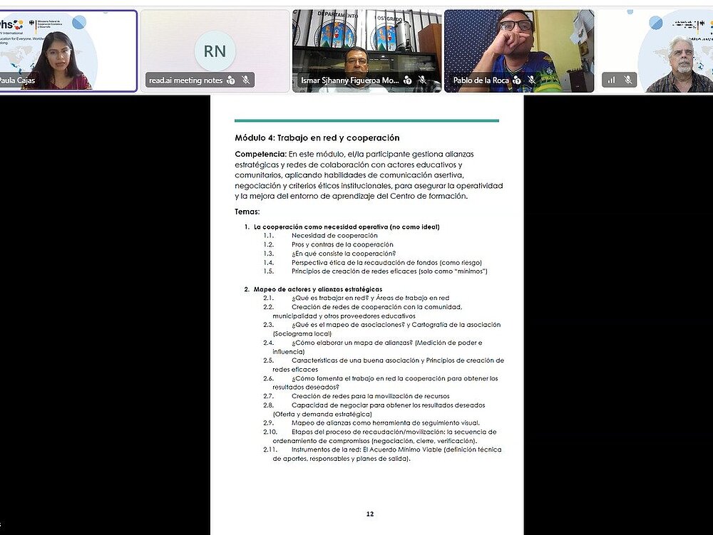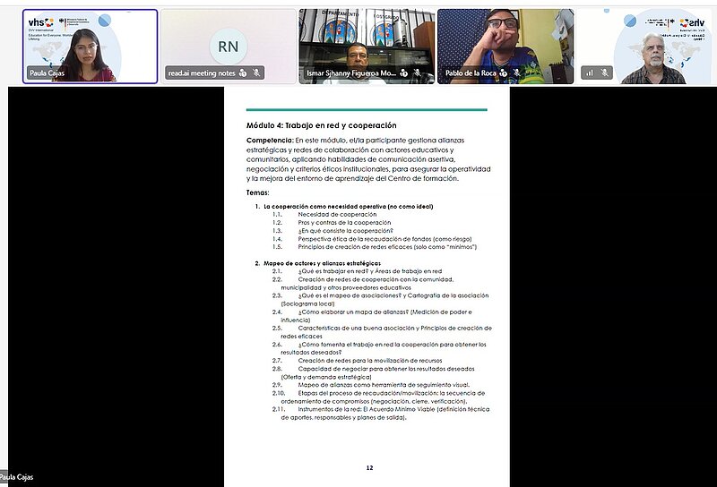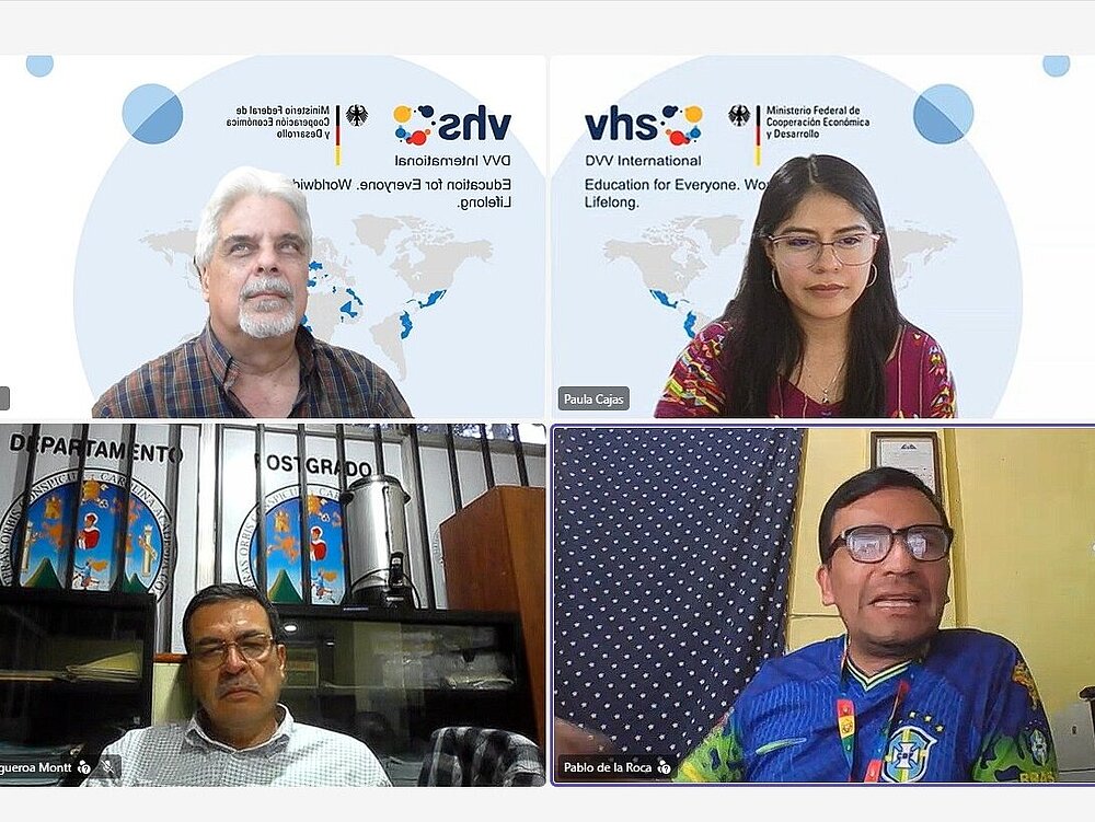 En un esfuerzo por fortalecer la Educación de Personas Jóvenes y Adultas (EPJA) en Guatemala, representantes de DVV International y del Centro Universitario de Noroccidente (CUNOROC) de la Universidad de San Carlos sostuvieron una reunión virtual el pasado 13 de marzo. El encuentro sirvió para revisar avances y coordinar acciones conjuntas en materia de formación docente, redes académicas y nuevas iniciativas regionales.