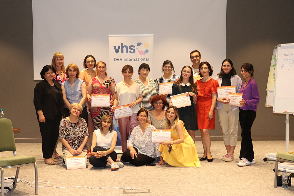 Many things were thought-provoking and new during the training, which, together with the previous modules, gave a pleasant experience for the participants. At the end of the training, the participants received a certificate of participation in the third level. The directors of Adult Learning and Education (ALE) centers, adult education coordinators of state vocational colleges, the Georgian Adult Education Network (GAEN), and DVV International Georgia Country office employees are participating in the training programme.