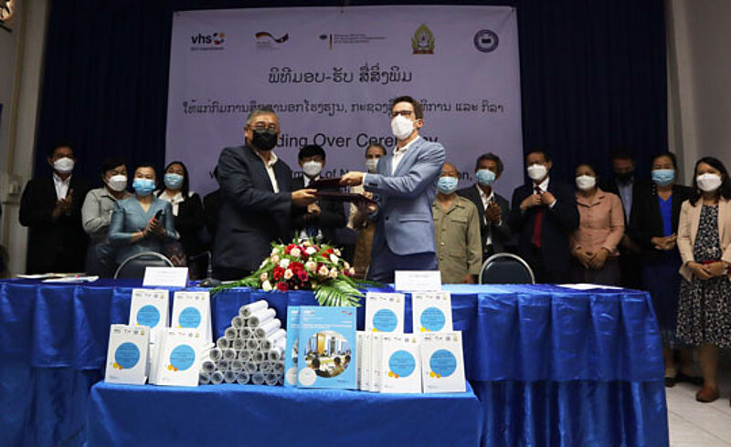 DVV International, the German Adult Education Association, supports the establishment of sustainable structures for adult education and lifelong learning in Lao PDR. For many years, the Department of Non-Formal Education (DNFE) in the Ministry of Education and Sports has been its main partner. In the ceremony, DVV International and the DNFE pledged their commitment to the mutual objectives and 2000 diaries, 1500 calendars, 500 wall calendars and 400 DVV newsletters were handed over to DNFE. The handing over certificate was signed by SIsana Boupha, Director General of the Department and Dr. Johann Heilmann, Regional Director for Southeast Asia of DVV International. The two sides further signed an agreement on the activities that will be carried out with financial support from the German Ministry of Economic Cooperation and Development in 2022. These activities will focus on the implementation of the Decree for Lifelong Learning, further strengthening of the structures of the non-formal education system and the piloting of adult education approaches benefitting especially women in rural and remote areas.