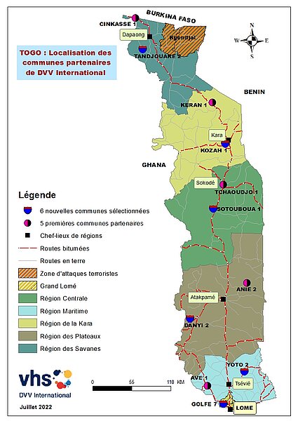 Vu l’intérêt que les bénéficiaires portent pour ces activités d’éducation des adultes, DVV International a souhaité passer à l’échelle à la prochaine phase du projet SSF au Togo qui démarrera en 2023 en augmentant le nombre de communes partenaires. C’est dans cet optique que les bureaux des cadres régionaux de concertation élargis aux directeurs préfectoraux de l’action sociale, de la promotion de la femme et de l’alphabétisation ont tenu simultanément le 14 juillet 2022, des rencontres pour sélectionner chacun une commune dans sa région. Ces rencontres de sélection des communes ont été menées sous la supervision de l’équipe technique de DVV International et de quatre cadres de la direction générale de l’alphabétisation et de l’éducation non formelle (DGAENF) dont le Directeur Général lui-même. Cette nouvelle sélection de communes s’est basée sur les mêmes critères validés avec la DGAENF en 2021 et qui ont permis de sélectionner les cinq (05) premières communes. A l’issu des rencontres, six (06) nouvelles communes ont été sélectionnées à raison d’une commune par région. Il s’agit notamment de :