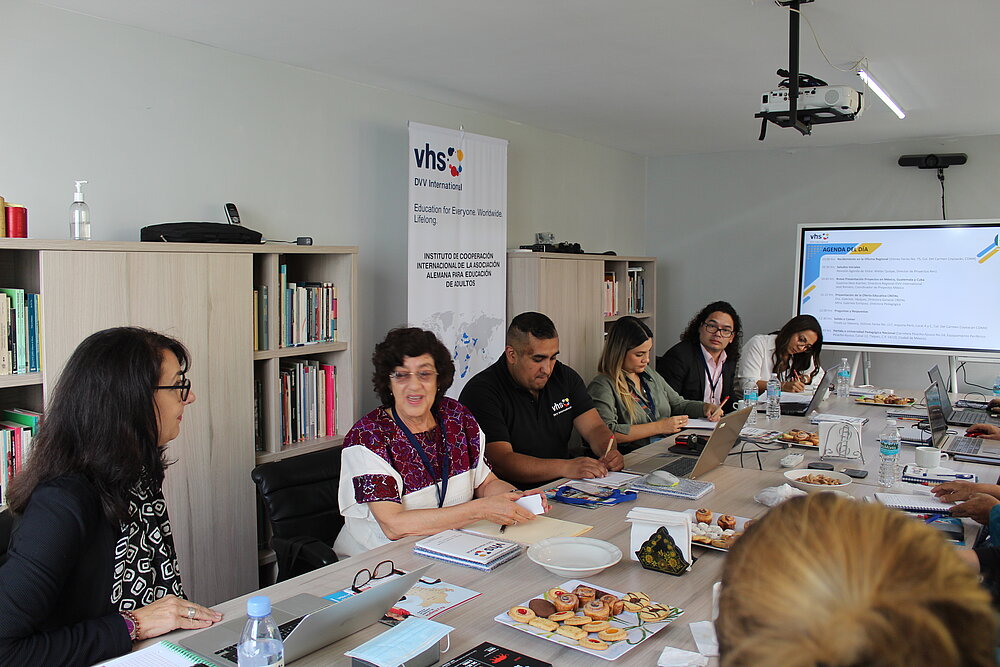 El lunes 22 de mayo de 2023, la oficina regional de Centroamérica, México y El Caribe de la DVV International recibió a Meike Woller, Directora de la Oficina Regional Sudamérica; Laura Alarcón, Directora de la Oficina Nacional de Colombia; Ana Isabel Delgado, Coordinadora del Proyecto Ecuador y Walter Quispe, Director Nacional de Perú. El objetivo de este encuentro es generar un intercambio de experiencias y estrategias de trabajo en torno a la educación para jóvenes y adultos (EPJA), con miras a posibles colaboraciones y oportunidades de trabajo conjuntas.