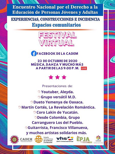 Este viernes 23 y sábado 24 de octubre, la Campaña por el Derecho a la Educación en México (CADEM) en alianza con la CLADE, la Red EPJA y con el apoyo de DVV International, realizan mediante la modalidad virtual el Encuentro Nacional por el Derecho a la Educación de Personas Jóvenes y Adultas "Experiencias, Construcciones e Incidencias"