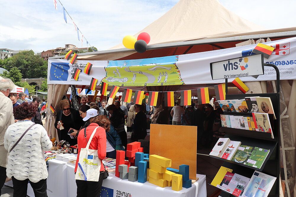 The space at the event was distributed among the EU member state representatives. Therefore, DVV International Georgia shared a stand with German Embassy, DAAD, Goethe Institute, and GIZ. DVV International exhibited organisation’s publications. Furthermore, the visitors could play a fun puzzle game and receive presents in case of winning. Finally, "Lelis Tapli" produced by the Leliani Adult Education Center, and handmade toys and accessories by the Koda Community Education Center were offered to the guests.