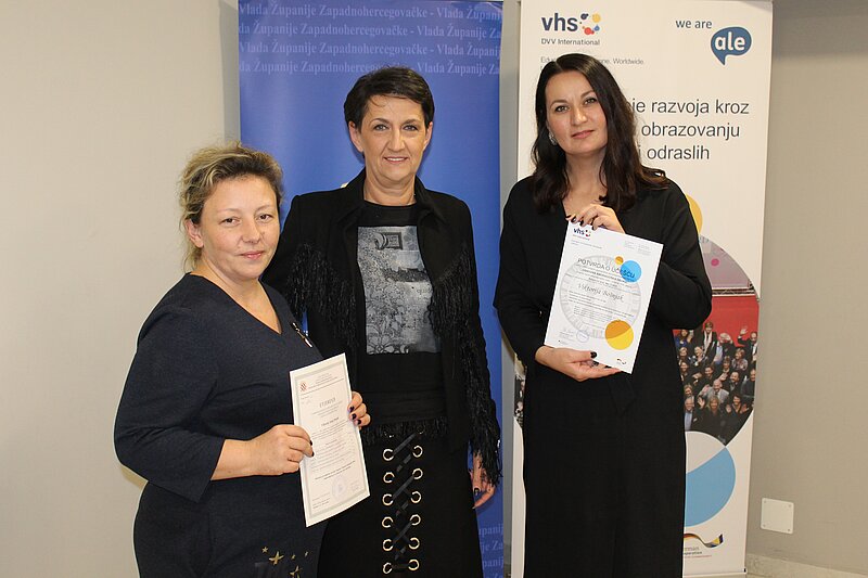 The training in West Herzegovina Canton ended with the supervision held from the 7th to the 9th of December. Twenty-one participants met all requirements to receive the publicly valid certificate on andragogical development. The certificates were awarded by Minister of Education, Science, Culture and Sport Ms. Ružica Mikulić, Deputy Director from the DVV International – Country Office BiH Ms. Dženita Džano and Project Coordinator Ms. Ajla Sijerčić.