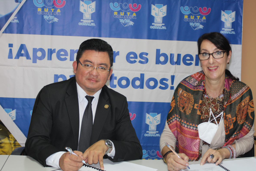 Los firmantes de este convenio fueron Susanna Hess Kalcher, Directora Regional para DVV International Centroamérica, México y El Caribe, y Otto Rubén Barrera Hernández, Secretario Ejecutivo CONALFA, quienes se comprometieron a crear oportunidades para las personas adultas, de acceder a los servicios de educación escolar acelerado, educación extra escolar, capacitación laboral y desarrollo cultural.
