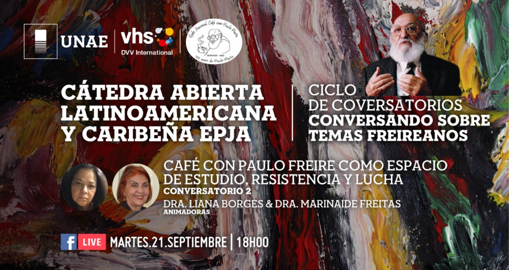 La Universidad Nacional de Educación y DVV International realizan la cordial invitación a participar del Conversatorio "Café con Paulo Freire como espacio de estudio, resistencia y lucha" a cargo de la Dra. Liana Borges y la Dra. Marinaide Freitas, que se llevará a cabo el día 21 de septiembre de 2021, a las 18h00 (hora Ecuador, Perú) 20h00 (hora Brasil, Chile), mediante el Facebook Live de la Universidad Nacional de Educación UNAE.