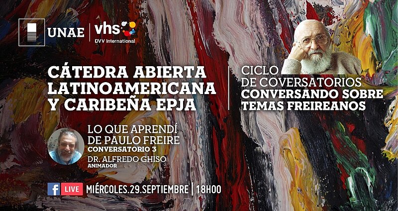 La Universidad Nacional de Educación (UNAE) y DVV International realizan la cordial invitación a participar del Conversatorio: Lo que aprendí de Paulo Freire a cargo del Dr. Alfredo Ghiso, que se llevará a cabo el día 29 de septiembre de 2021, a las 18h00 (hora Ecuador, Perú, Colombia) 20h00 (hora Brasil, Chile), mediante el Facebook Live de la Universidad Nacional de Educación UNAE.