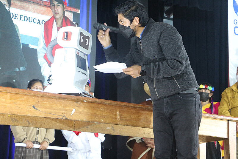 „JOVAM, sag mir einen Zungenbrecher auf Deutsch.“ Der junge Ingenieur und Lehrer Walter Velasquez aus Colcabamba, einem kleinen Dorf südlich von Lima, hält das Mikrofon an den Kopf seines kleinen Roboters. „Fischers Fritze fischt frische Fische“ tönt eine etwas blecherne aber gut verstehbare Stimme durch das Mikrofon. JOVAM blinkt mit seinen beiden großen Augen. Das Publikum lacht. Die Feuerprobe seines ersten öffentlichen Auftritts hat der Roboter im Rahmen der jährlich stattfindenden Konferenz zur Erwachsenenbildung, die vom 26.-28.10.2021 hybrid in Cajamarca (800 Kilometer nördlich von Lima) durchgeführt wurde, mit Bravour bestanden.