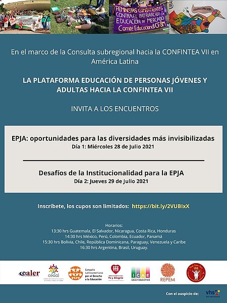 La Coalición Colombiana por el Derecho a la Educación, en colaboración con el Consejo de Educación Popular de América Latina (CEAAL), la Campaña Latinoamericana por la Educación (CLADE), la Federación Internacional Fe y Alegría (FIFYA), el Consejo Internacional de Educación de Adultos (ICAE) y la Red de Educación Popular Entre Mujeres de América Latina y El Caribe (REPEM), invita a los encuentros paralelos en el marco de la Consulta subregional de Educación para Jóvenes y Adultos a realizarse el 28 y 29 de julio de 2021.