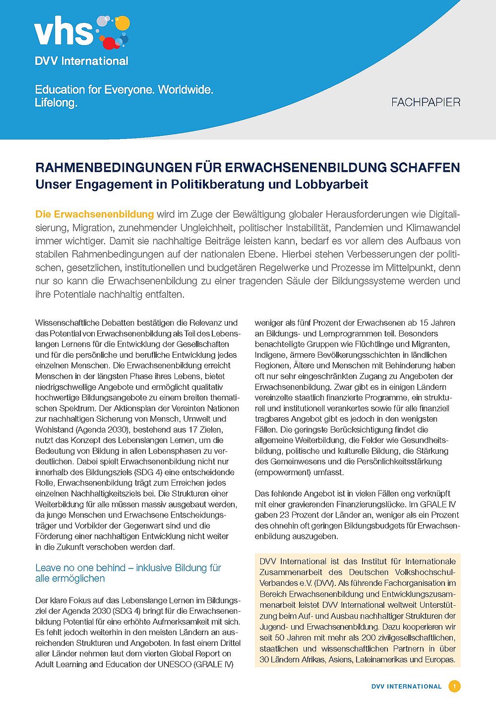 Im neu erschienenen Fachpapier stellt DVV International sein Engagement im Feld der Politikberatung und Lobbyarbeit dar und veranschaulicht dieses mit internationalen Beispielen aus der Praxis.