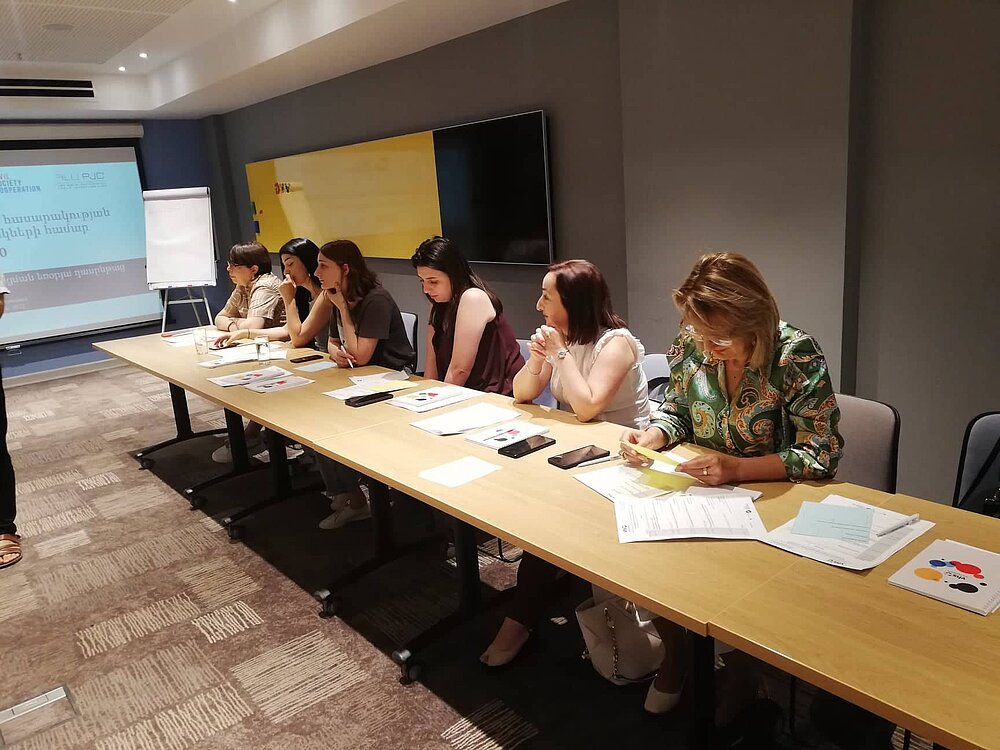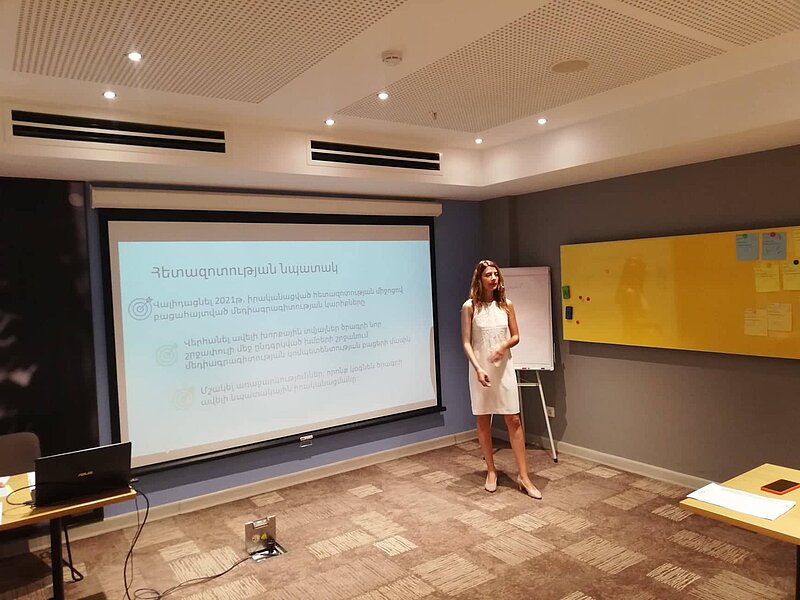 The project was officially launched on August 26, 2022, with a three-day capacity building training of trainers (ToT) for the trainers of partner CSOs involved in the project. The training started with the presentation of the qualitative study on media literacy among the target groups carried out within the framework of the project by researcher Arpine Mazhinyan.