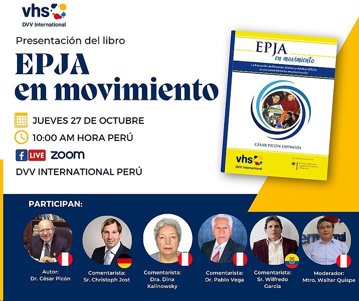 El jueves 27 de octubre DVV International Perú presentará el libro “EPJA en movimiento”, la última obra del Dr. César Picón. En la presentación participarán el Sr. Christoph Jost director de DVV International, desde Bonn, Alemania; la Sra. Meike Woller, Directora de la Oficina Regional Sudamérica de a DVV International, la Dra. Dina Kalinowsky experta en EPJA, el Dr. Wilfredo García representante de la Universidad Nacional de Educación de Ecuador y como moderador, el Mtro. Walter Quispe Director Nacional de DVV International Perú.