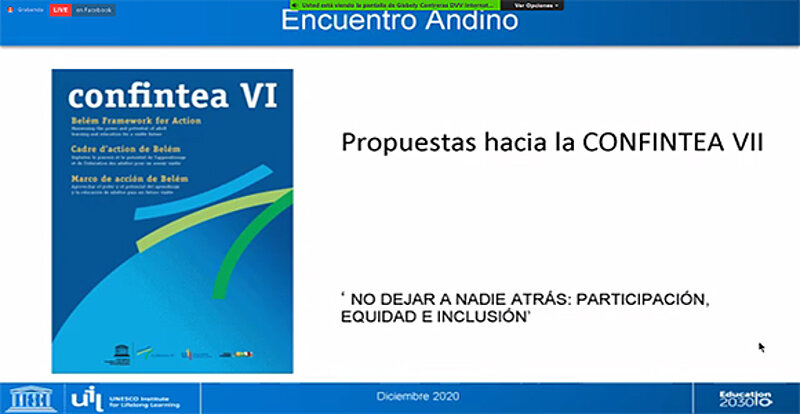 Los días 08, 09 y 10 de diciembre de 2020 se realizó de manera virtual con sede en Perú, el V Encuentro Andino de Educación de Personas Jóvenes y Adultas “Rol y valor social de la Educación de Personas Jóvenes y Adultas en los contextos de crisis y en el desarrollo sostenible”. El encuentro organizado por DVV International, viene realizándose desde el año 2012, en Quito, Ecuador. Posteriormente fueron: el año 2013 en Perú, 2016 en Bolivia, 2018 en Ecuador y su Quinta Edición se realizó de manera virtual por el contexto de la pandemia de Covid 19 desde Perú.