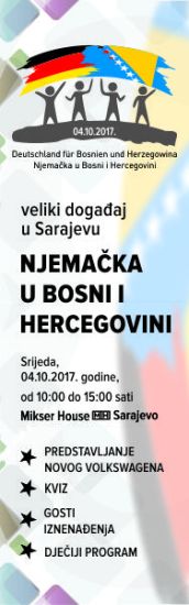 Because of that, the German organizations in B&H will get together again on 4th of October and present their activities to all visitors of the event. Besides the Delegation of German Economic Affairs in B&H, and the German Embassy, the visitors will have a chance to find out more about the work of DAAD, GIZ, DVV International, Goethe Institute, KFW, Deutsche Tourismus Zentrale, and Messe München International, as well as of the foundations Friedrich Ebert, Konrad Adenauer, and Heinrich Böll, and also about the work of nongovernment organizations in B&H supported by Germany.