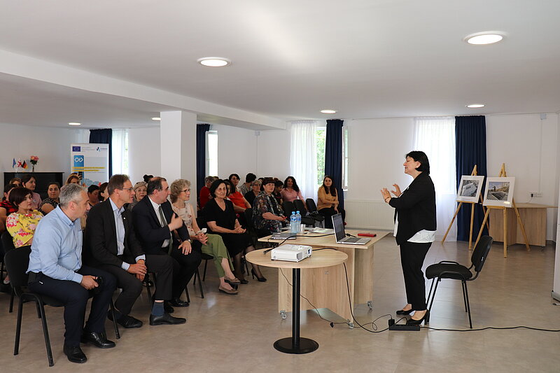A tour of the Bolnisi Adult Education Center was followed by a presentation about the Bolnisi Adult Education Center presented by the center director, Ms. Irma Zurabashvili. Bolnisi Adult Education Center is the 13th AECs established by the DVV International Georgia Country office. The center has been functioning for only one year but already has many beneficiaries. From May 2021 to May 2022, Adult Learning Pack, vocational, personal development, civic, cultural, and financial education was provided to 2257 beneficiaries. The center's director thanked the German government, the German Embassy in Georgia, and DVV International Georgia Country office for their commitment and support. Among the guests were also directors of Jvari and Koda Adult Education centers, and they shared their experiences, success stories, and challenges with the guests.