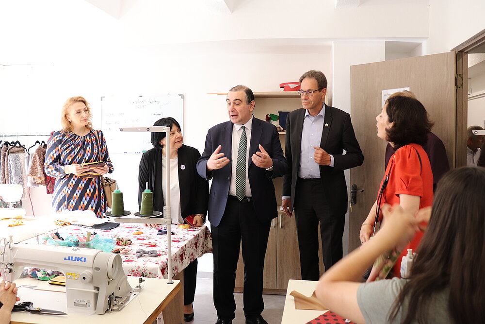 The guests had the opportunity to meet and talk with students, both adults, and youth, in person, learn more about the situation in the center, listen to students' experiences, and find out success stories of people who were employed/self-employed after completion of courses provided by the center. The Ambassador and the Minister visited several workshops and classes in welding, wood carving, English language, handcrafted souvenirs, felting, sewing, IT, culinary, and makeup.