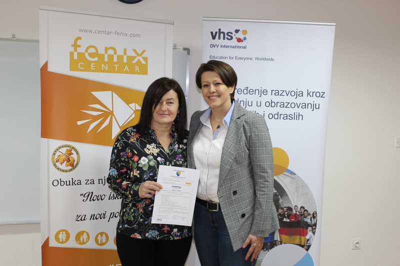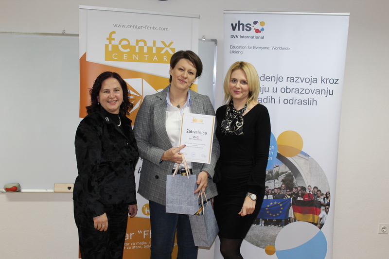Within the project „New experience for new beginning - Training for caregivers“, the Fenix Center organised a Certificate Award for 23 long-term unemployed persons on 30th of November 2018. The Certificates were awarded by Ms Adisa Hotić, director of the Fenix Center, and Ms Emina Herić, representative of DVV International - Country Office Bosnia and Herzegovina.