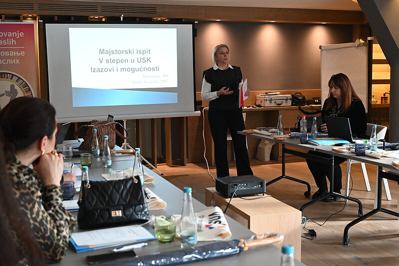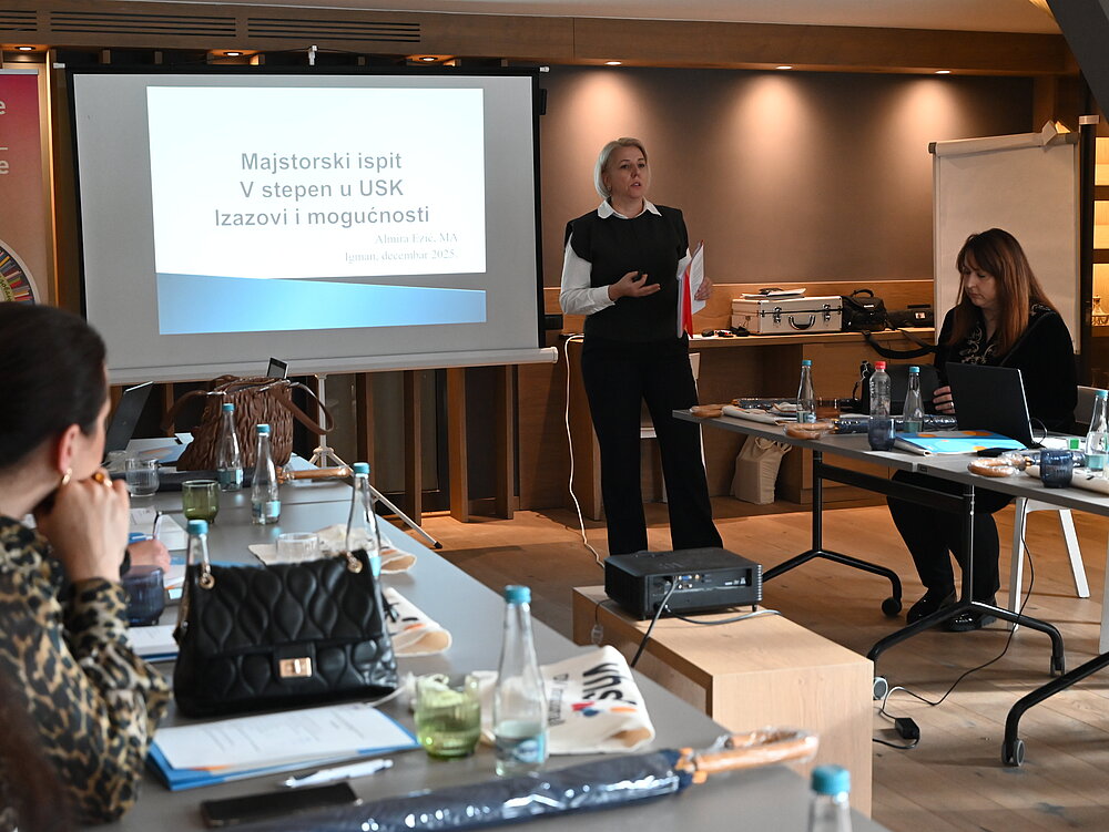 Next, Almira Ezić presented the topic “Master Craftsman Exam, Level V in Una-Sana Canton – Challenges and Opportunities,” which opened a discussion on qualification standards and labor market needs. Special focus was placed on the challenges of implementing the master craftsman exam and the opportunities it offers for improving vocational adult education.