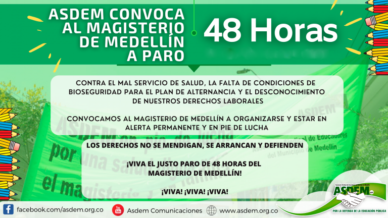 La Asociación Sindical De Educadores del municipio de Medellín convocó al magisterio de Medellín a paro de 48 horas. Luego de que el Ministerio de Educación Nacional de Colombia diera 30 días a…