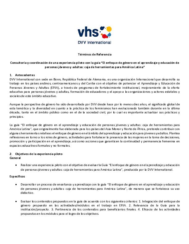 La Oficina Regional Sudamérica de la DVV International requiere contratar un consultor o consultora para desarrollar la Consultoría y coordinación de una experiencia piloto con la guía “El…