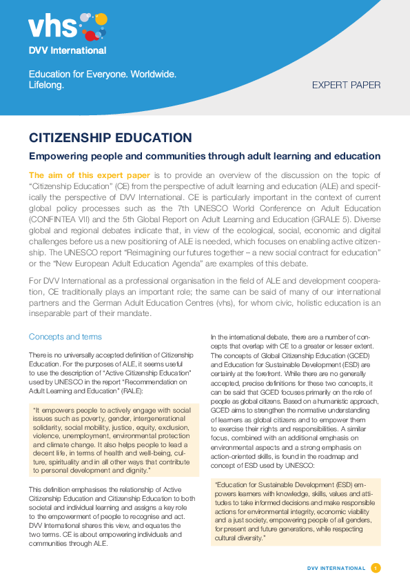 DVV International hat ein neues, englischsprachiges Fachpapier zum Thema „Citizenship Education – Empowering people and communities through adult learning and education“ veröffentlicht. Das Ziel…