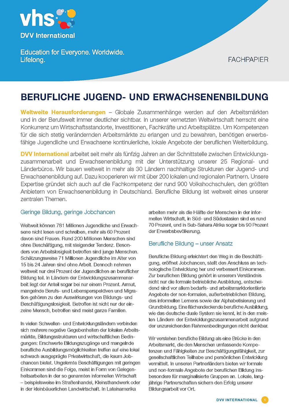 Mit einem neuen Publikationsformat, dem "Fachpapier", bringt DVV International aktuelle Themen der Erwachsenenbildung und Entwicklungszusammenarbeit in die fachliche und öffentliche Debatte ein.