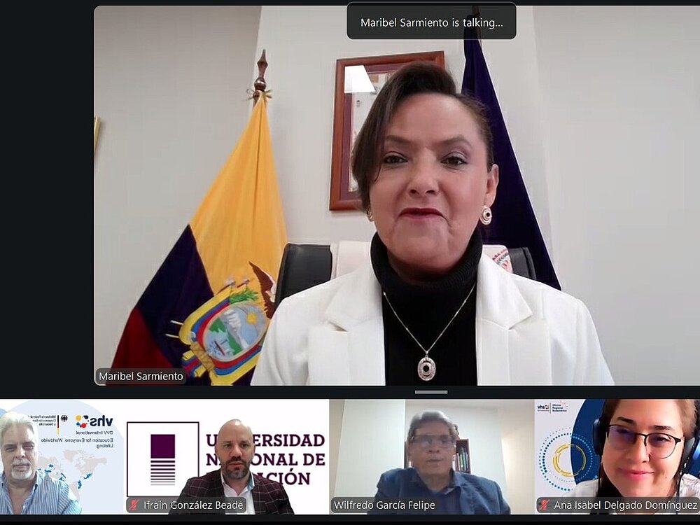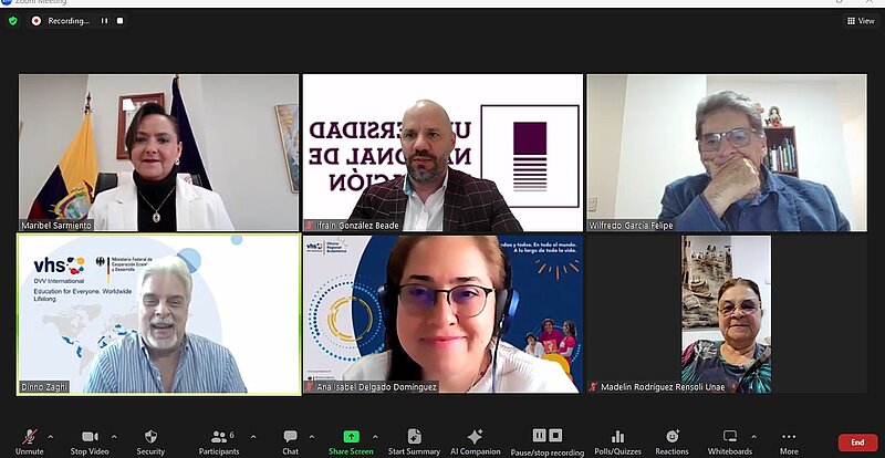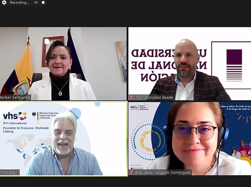 El 5 de enero de 2026 se llevó a cabo una reunión virtual entre la Rectora de la Universidad Nacional de Educación (UNAE) de Ecuador, Dra. Maribel Sarmiento, el equipo del programa Rutas Pedagógicas y los coordinadores de proyectos de DVV International en Ecuador y Guatemala. El objetivo fue revisar las actividades planificadas para 2026 en el marco del fortalecimiento de la co-construcción comunitaria y la Educación para Personas Jóvenes y Adultas (EPJA).