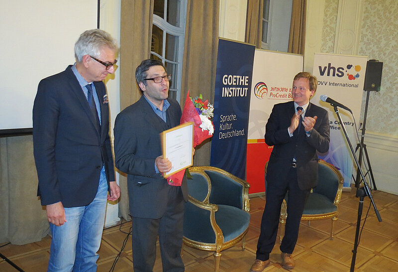 Dr. Stephan Wackwitz, Leiter des Goethe-Instituts Georgien und Matthias Klingenberg, Regionalleiter von DVV International, übergaben schließlich den mit 4.000 EUR dotierten Preis an Lascha Bakradze, der den Anwesenden sichtlich gerührt seinen Dank aussprach.