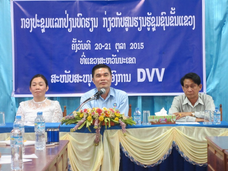 ໃນວັນທີ 21-22 ເດືອນ ຕຸລາ ປີ 2015, ທາງພະແນກສຶກສາ ແລະ ກິລາ ແຂວງສະຫັນນະເຂດ ຮ່ວມມືກັບ ອົງການ ດີວີວີ, ໄດ້ຈັດຝຶກອົບຮົມຂື້ນ ກ່ຽວກັບ ການແລກປ່ຽນບົດຮຽນ-ການຄຸ້ມຄອງ ສູນຮຽນຮູ້ຊຸມຊົນຂື້ນທີ່ ພະ ແນກສຶກສາທິການ ແລະ ກິລາ ແຂວງສະຫັວນນະເຂດ, ໂດຍມີຜູ້ເຂົ້າຮ່ວມທັງໝົດ 26 ຄົນ, ຍິງ 12 ຄົນ. ຜູ້ເຂົ້າ ຮ່ວມມາຈາກຂັ້ນບ້ານ, ເມືອງ, ແຂວງ ແລະ ຂັ້ນກະຊວງ,ໂດຍສະເພາະແມ່ນ ກົມການສຶກສາ ນອກໂຮງຮຽນ.