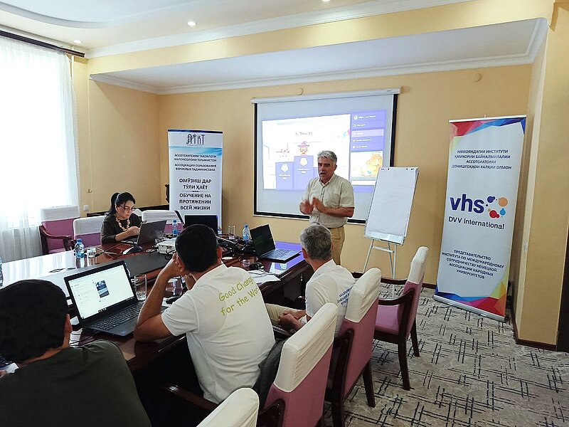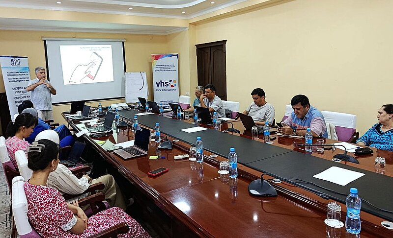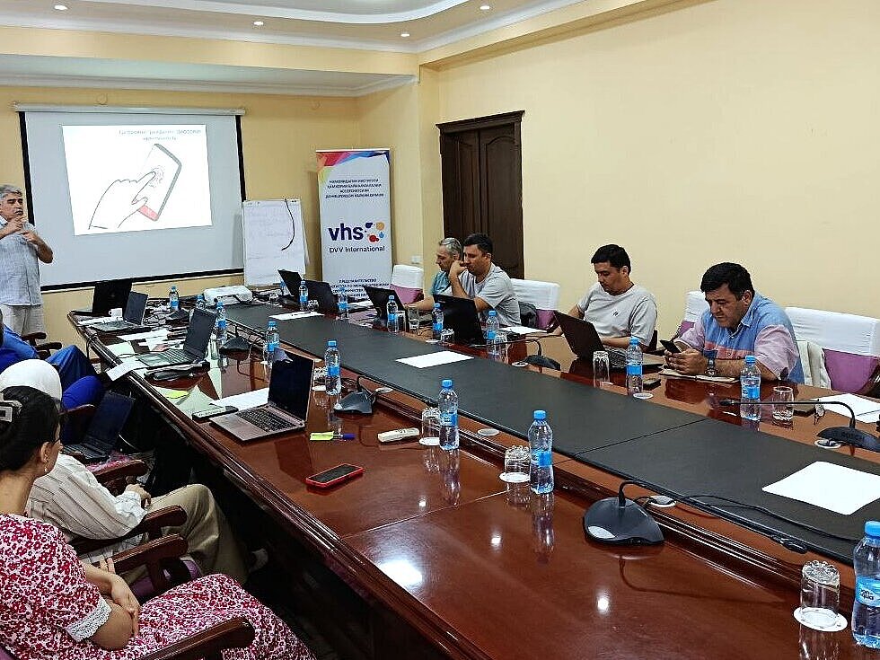 A review and analysis of the Curriculum digitALE, working with data and information, digital identity, security, and the creation of digital content were among the key topics examined and improved during a four-day workshop organized by the Adult Education Association of Tajikistan together with DVV International in Tajikistan. The event took place at the Training Center of the National Bank of Tajikistan in Guliston, Sughd region.