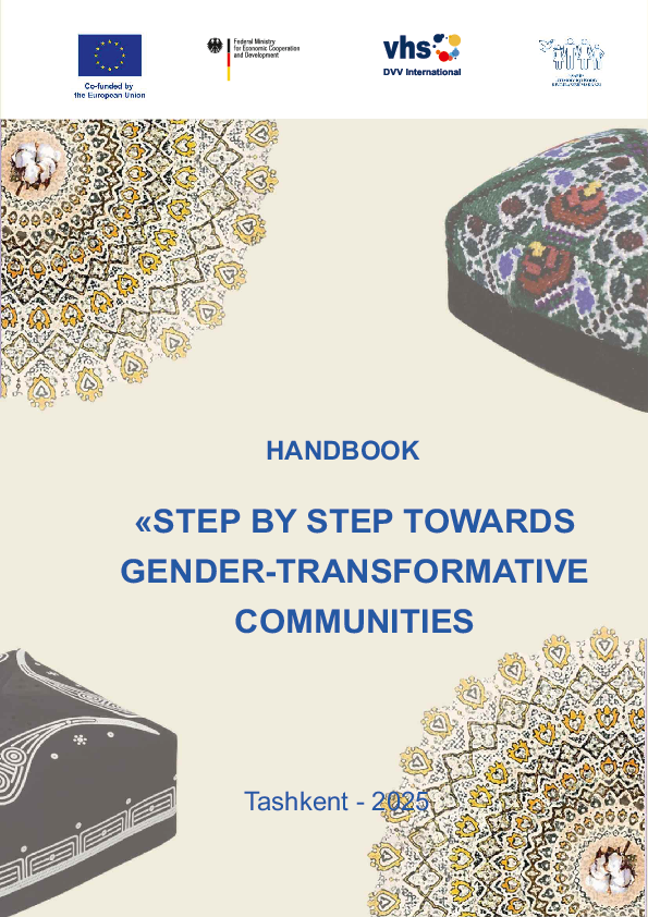 The handbook Step by Step Towards Gender-Transformative Communities was developed within the framework of the project “Promoting Gender -Transformative Communities through Civil Participation”, implemented with the financial support of the European Union and the Federal Ministry for Economic Cooperation and Development of Germany. The project is implemented by the offices of the DVV International Uzbekistan and the National Center for Socio-Economic Development “SABR” in cooperation with partners.